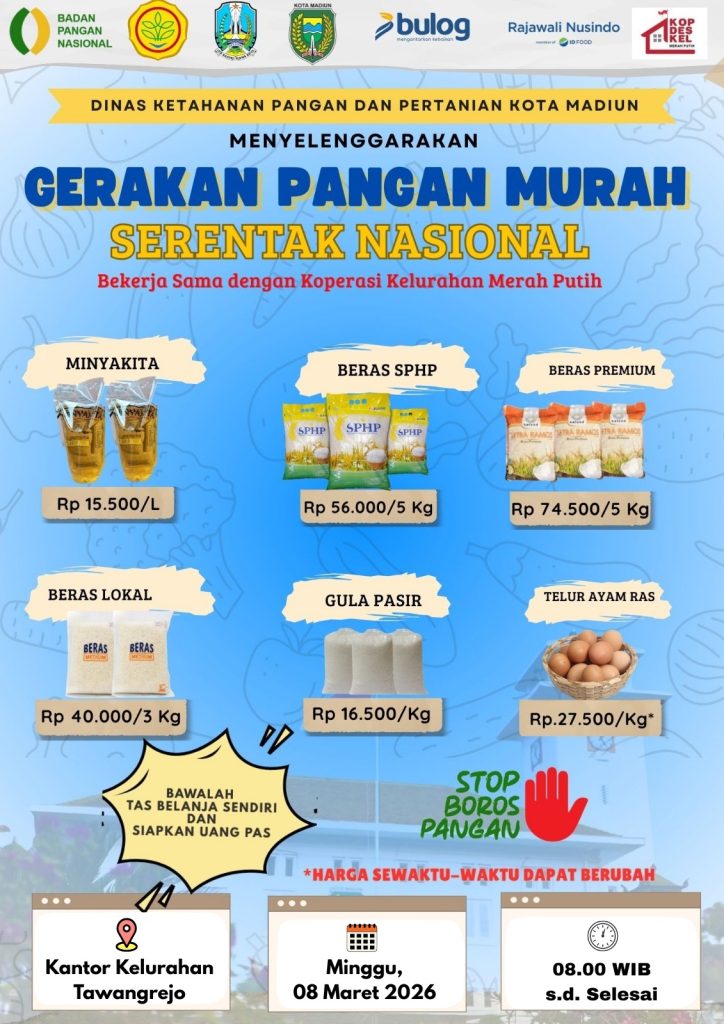 - Dinas Ketahanan Pangan dan Pertanian Kota Madiun Akan Menyelenggarakan Gerakan Pangan Murah yang bertempat di Kantor Kelurahan Tawangrejo Kecamatan Kartoharjo Kota Madiun pada hari Minggu, 8 Maret 2026 Pukul 08.00 WIB s.d. Selesai